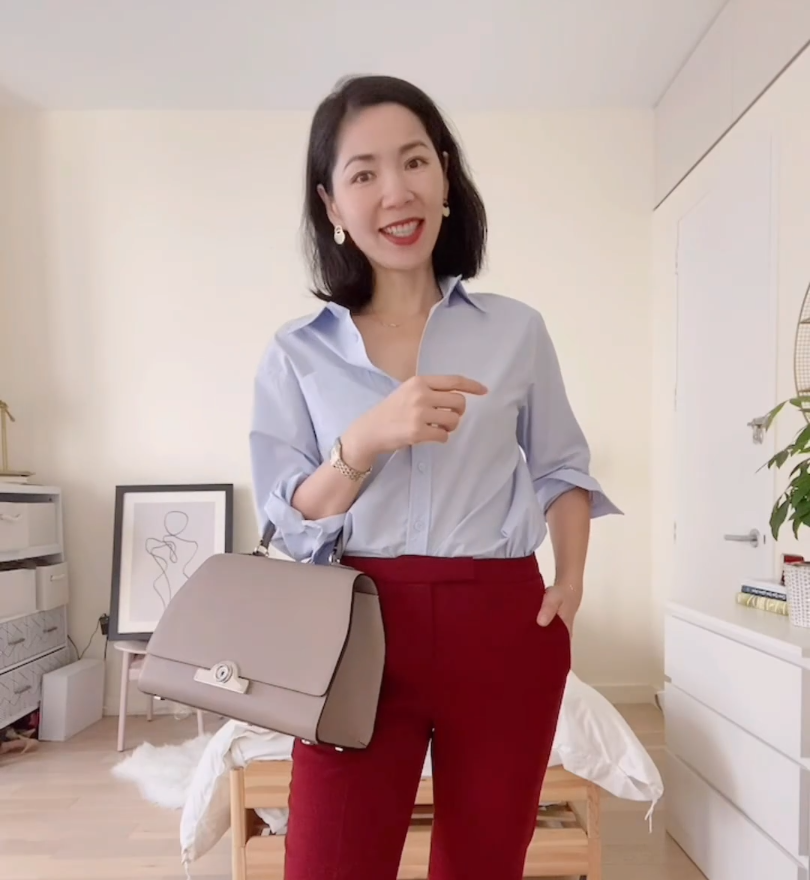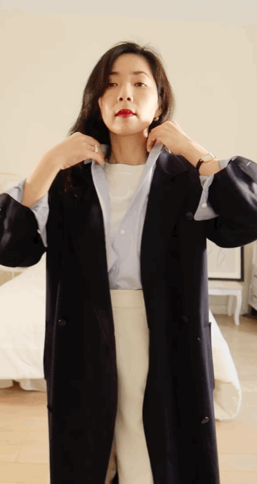 这个颜色也是小郑同款,我选的是baby蓝,我身高1.66米、体重114斤,穿 L 正好。穿的时候可以解开两粒纽扣,把袖子撸起来,有一种毫不费力的法式优雅感。