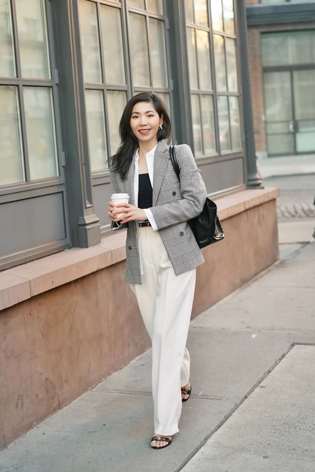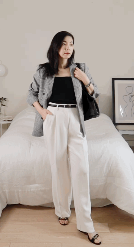 以前我只会穿黑裤子,因为自己不瘦,还是梨形身材,所以觉得黑色更能遮住自己的缺点。但是,最近才终于明白,其实白裤子能让穿搭更上一层楼。比如我穿黑色针织衫,搭配黑裤子,很无聊;,顿时不一样了,感觉高级了不少。再加一根皮带,增加精致度,整体时髦有型,很会穿。