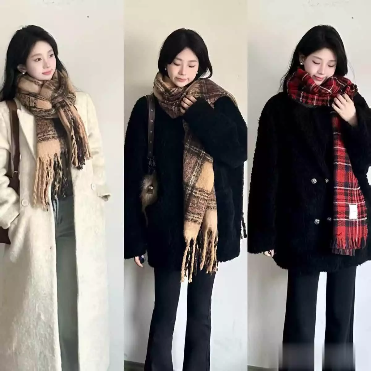例如,一条格纹围巾就能为传统的黑色裤装增添亮点;即使外披的是单一色调的黑色大衣,有了这条围巾的点缀,整个造型也会变得更加出彩。