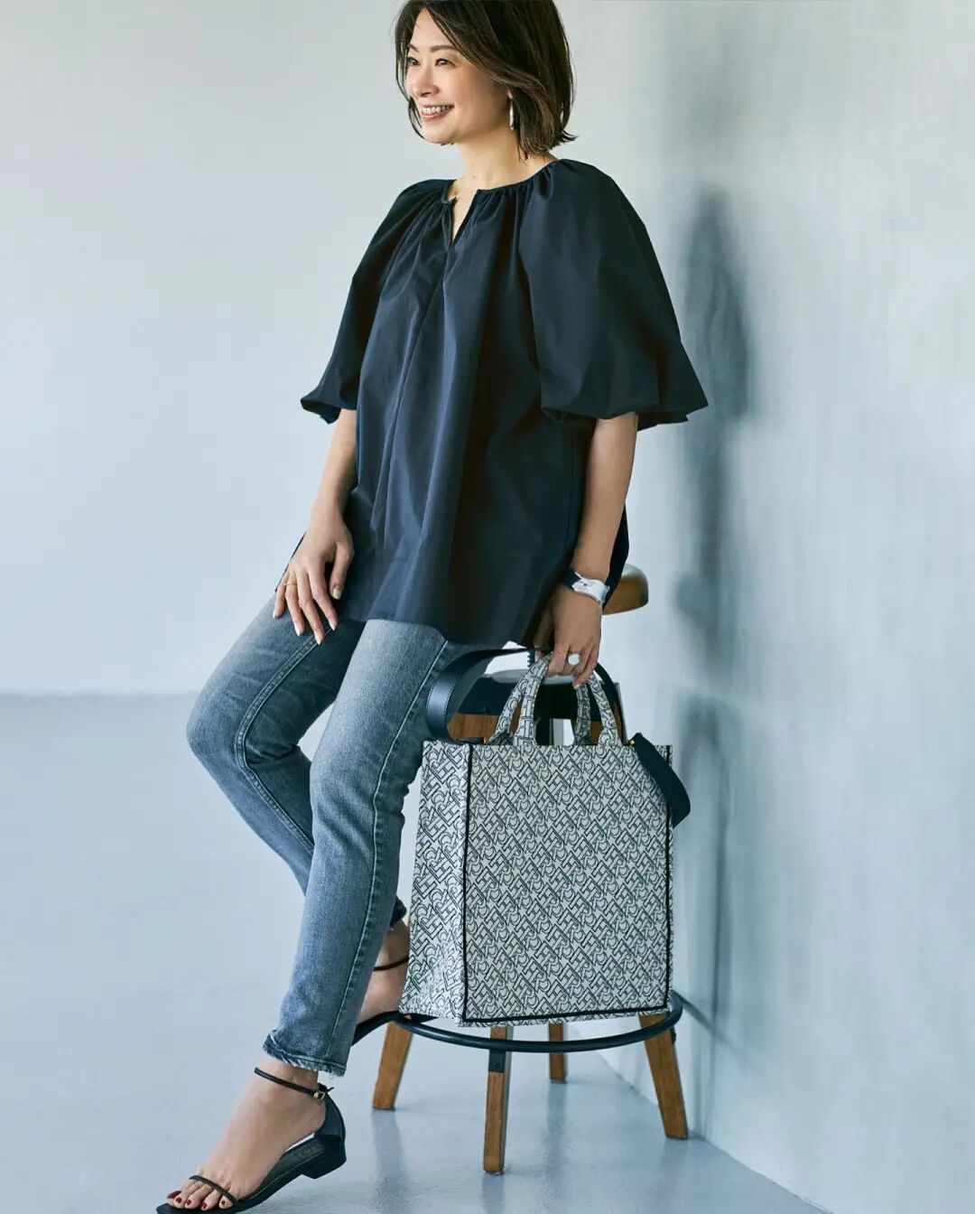 还是简单的牛仔裤搭配黑色罩衫,夏季穿黑色单品,可以选一些有设计概念的,比如喇叭袖、以及这种斜裁的袖口设计,都会让黑色显得不那么沉闷,更空灵一些。