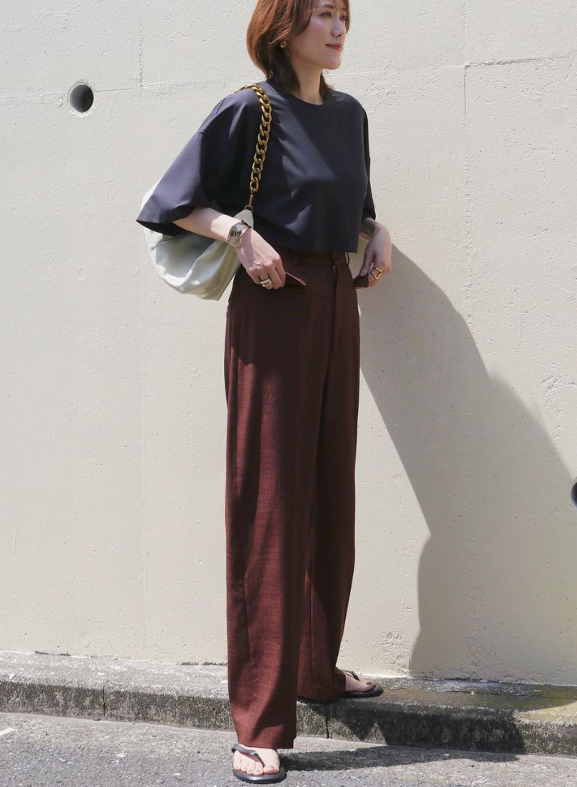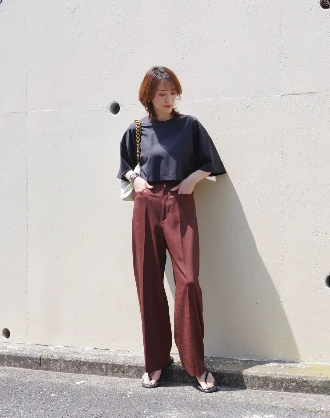 在金子三的这一套街拍很适合小个子女生,尤其是很强调腰身比,上半身的T恤属于高腰款,让下半身显得很长,而且裤子看上去很清凉,垂坠感不错,利用色差让身材比例更优秀。