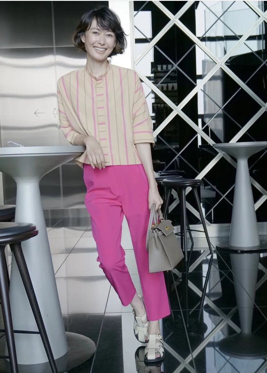 菊池京子很少看到她用到碎花,夏天来了,在她的ootd里面用了粉色的碎花,还有粉色的丝巾和包包,确实很亮眼,而且都是和蓝色搭配,夏天大家可以考虑下藏青色、蓝色和粉色混搭,不敢尝试大片的印花,可以从配饰上是试起来。