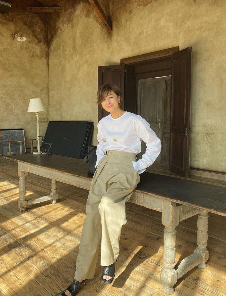三寻木的裤装搭配,其实也很克制简约。所有的单品都是纯色,黑色的罩衫在设计上做了一些很巧妙的设计,看起来整个人很有精气神,第二套的裤装是夏天喜欢白裤子的同学们可以参考的裤型,垂坠有线条感。