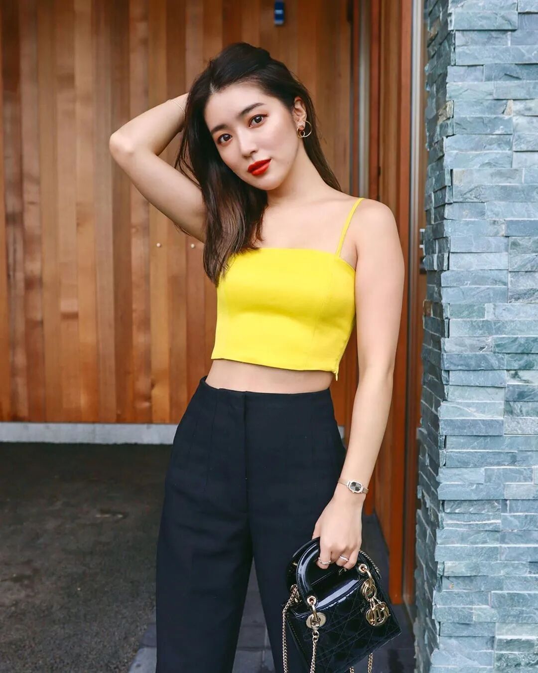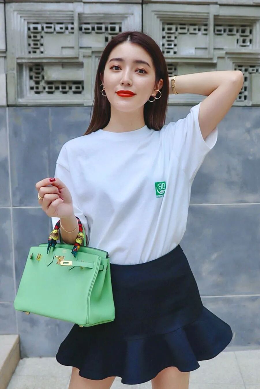 她很爱用亮色包包来做点缀,这招其实是最基本的套路,人人都会,但总是有些女生忘了用。其实家里衣服基础色多的话,亮色包包真的很出跳。