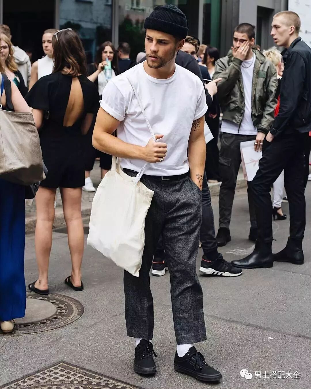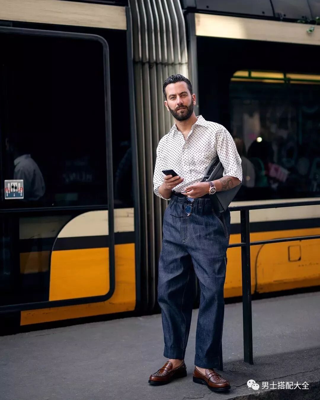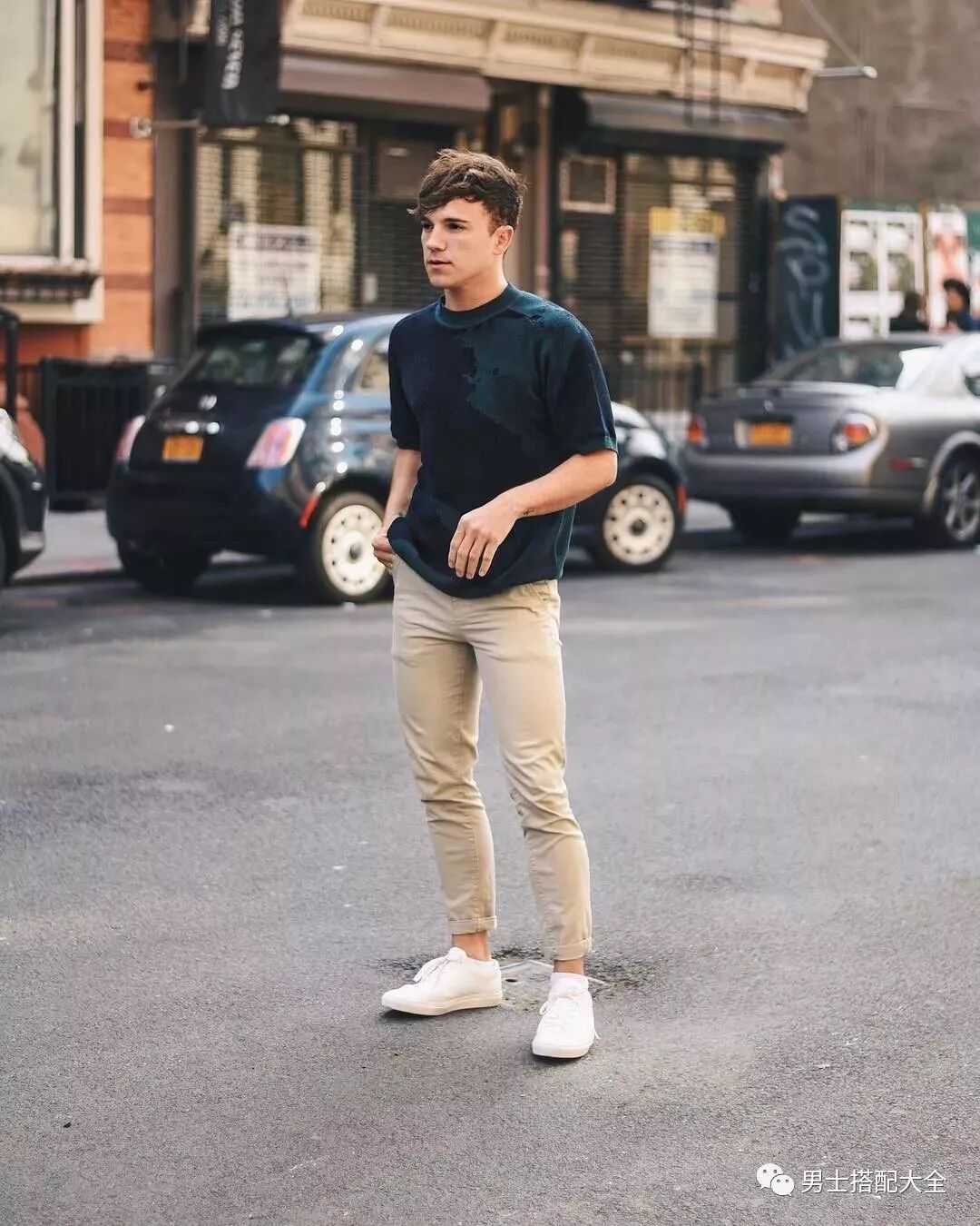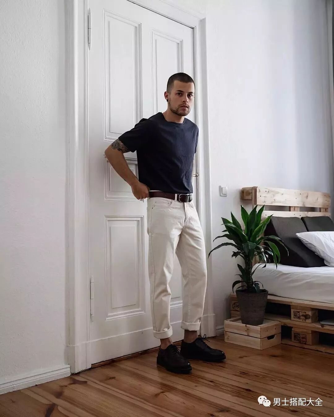 注意裤脚不要卷的太高,否则会截短你的腿部比例,另外不想卷裤脚的话,可以选择裤管刚好遮住鞋面的位置,值得强调的是千万不要让裤子堆叠在你的脚面上,这样非常的邋遢。