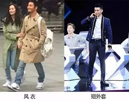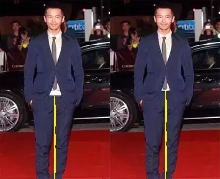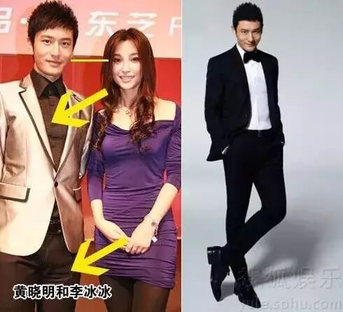 网上有很多对比图,你会看到其实没这么高。我们最熟知的增高办法就是穿增高鞋嘛,但这种是比较常见的方法。也不是我今天想讲的重点,重点是黄晓明通过了一些的穿搭技巧,让自己的确看起来增高了几厘米。