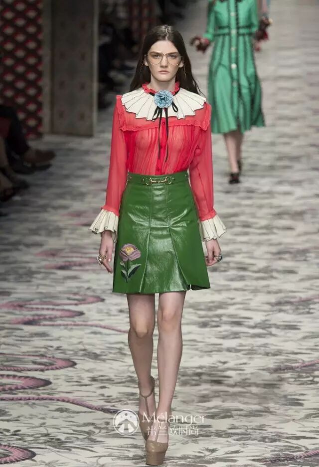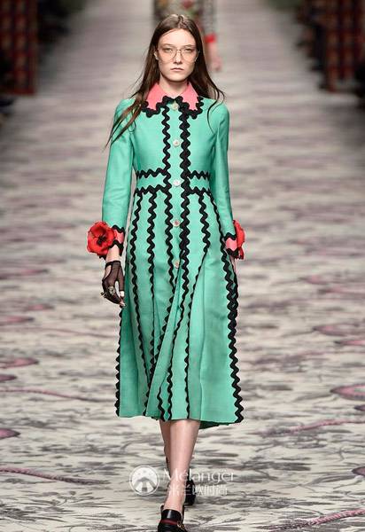 红和绿属于180°相对的色彩,如果比例是1:1的话,没有主次强弱之分,那么搭配起来就没有层次感和质感,Gucci的经典绿色为主色,搭配红色领子,手腕处大红花的点缀恰到好处,让整体造型更加精致。