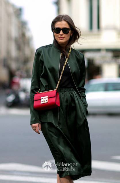 深绿色绸缎连衣裙搭配他同色系短夹克,如果没有了红色小包包的点缀,整个造型反而显得有点单调无奇对不对。