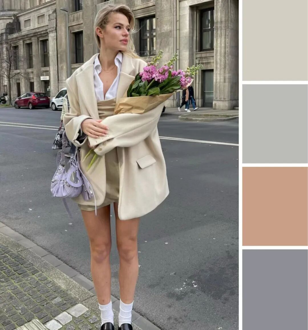 要注意统一整身穿搭的饱和度,低饱和的灰蓝/奶蓝色,更适合搭配白调的浅灰。
