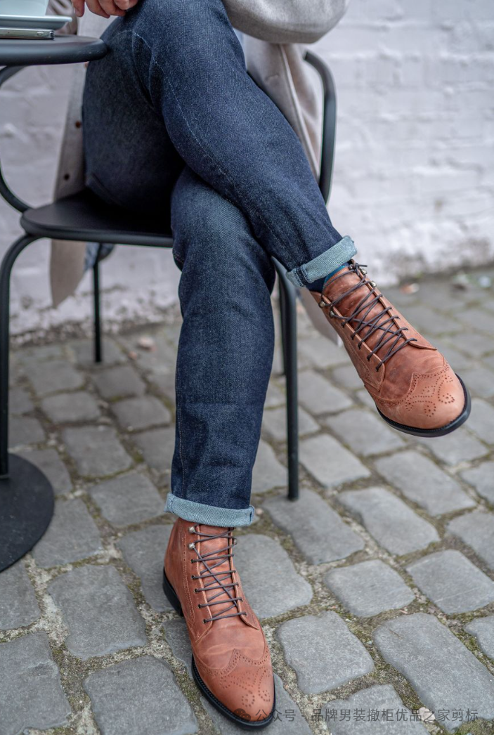 问:男士踝靴适合搭配翻边牛仔裤吗?答:当然!踝靴和翻边牛仔裤营造出现代感的外观,让脚踝或袜子微微一瞥。它增添了一丝细节,特别适合半休闲郊游或时尚的周末造型。