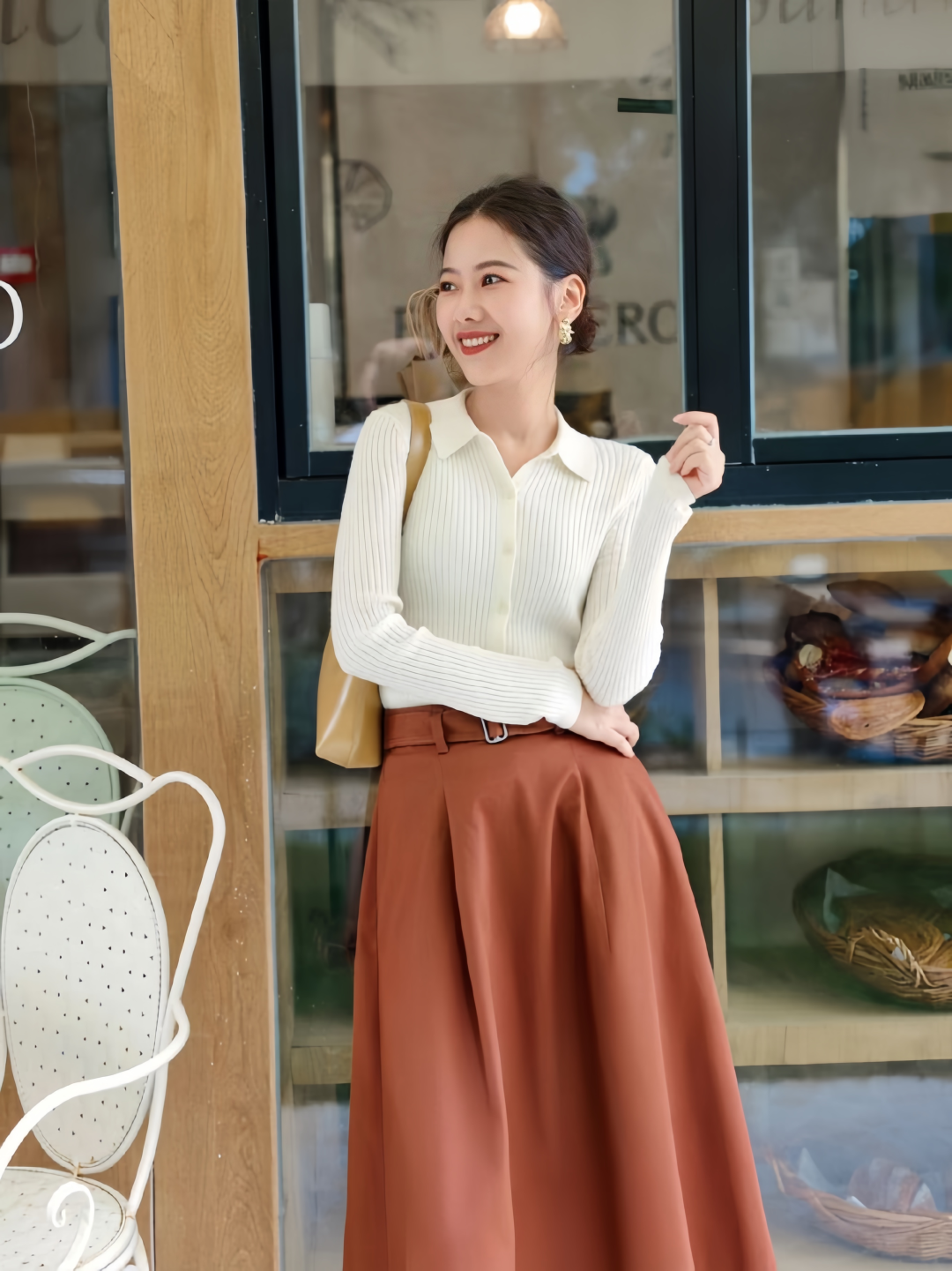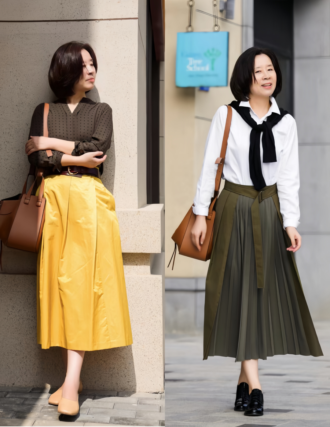 比如,我们可以选择波点深咖色上衣搭配姜黄色半身裙,又或者白衬衫搭配深色系百褶裙。
