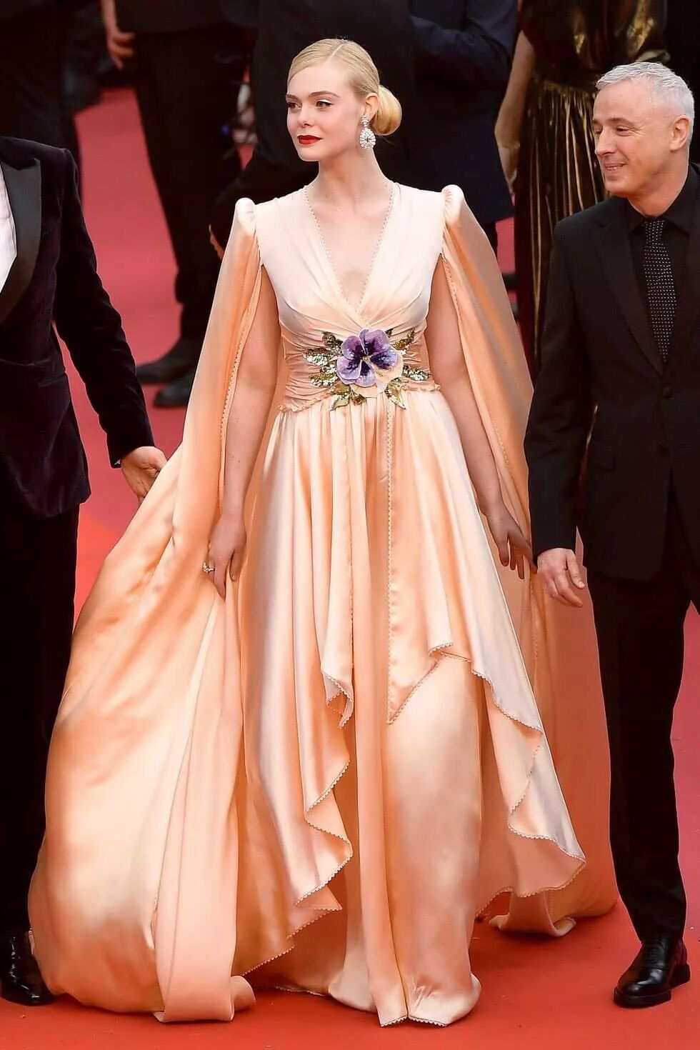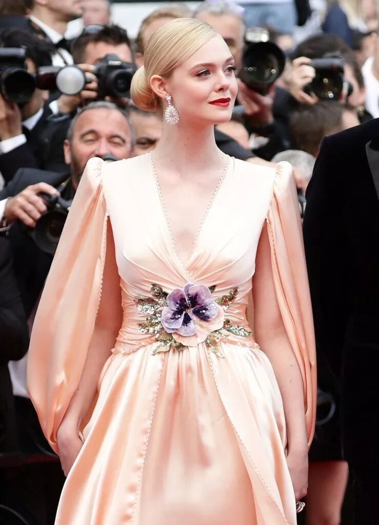 年纪最小评委Elle Fanning,穿着丝绸长裙亮相。红唇的精致,腰间的刺绣更是吸睛。