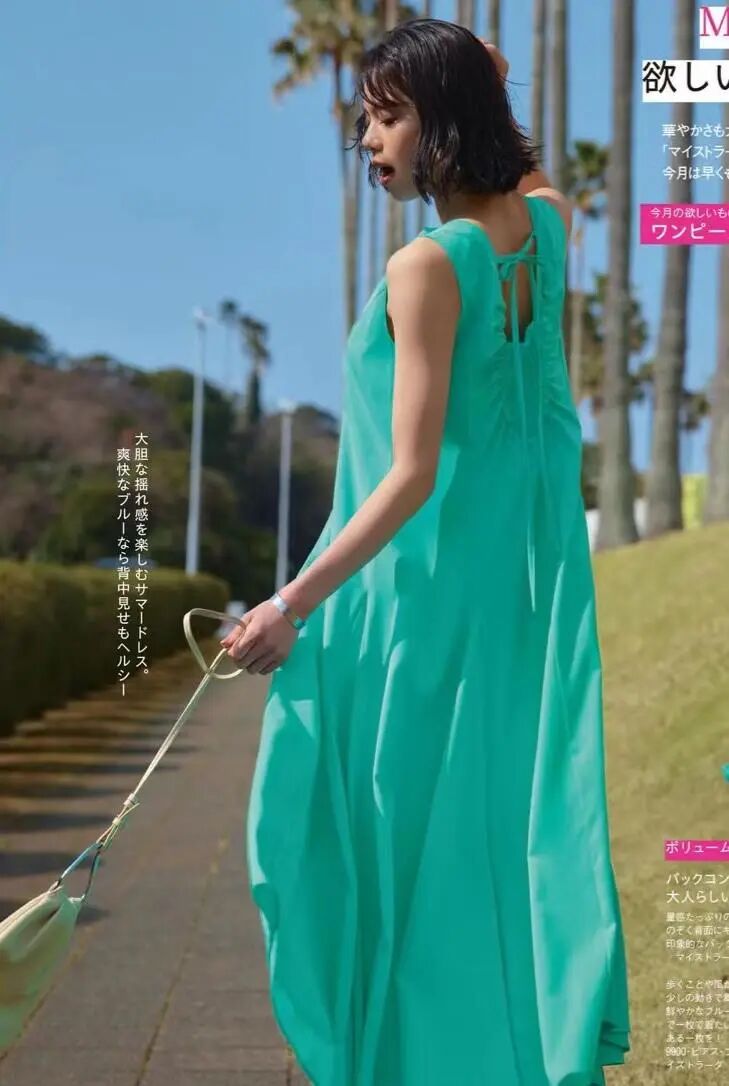 无袖、宽松、背后系带,诸多细节之下,这条蓝绿色长裙,出尽了风头。