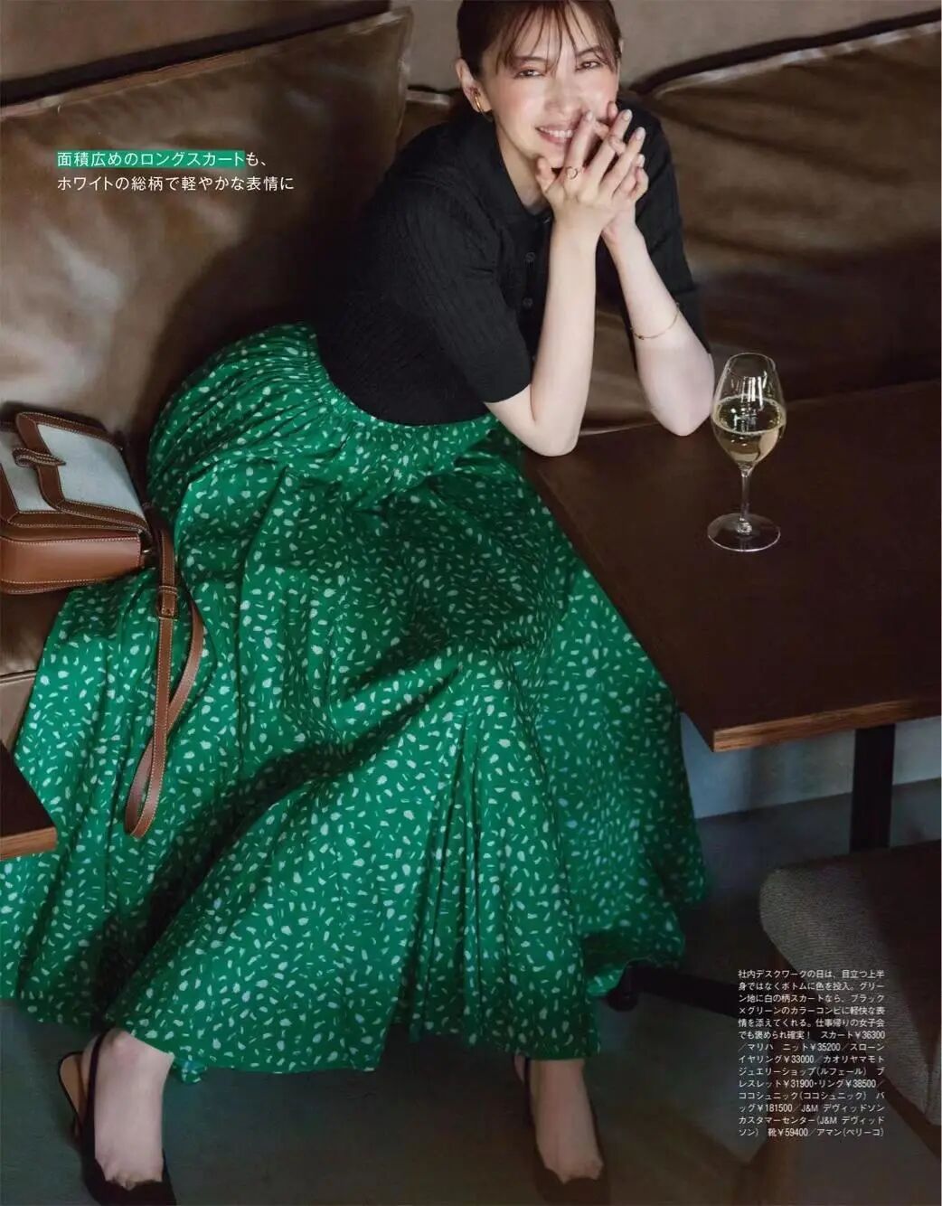 比如,嫩绿为主+正绿点缀。毛衣偏暖,与卡其半裙配合相宜,但却缺少动感。点缀一款绿色包包,正好获得配色升华。