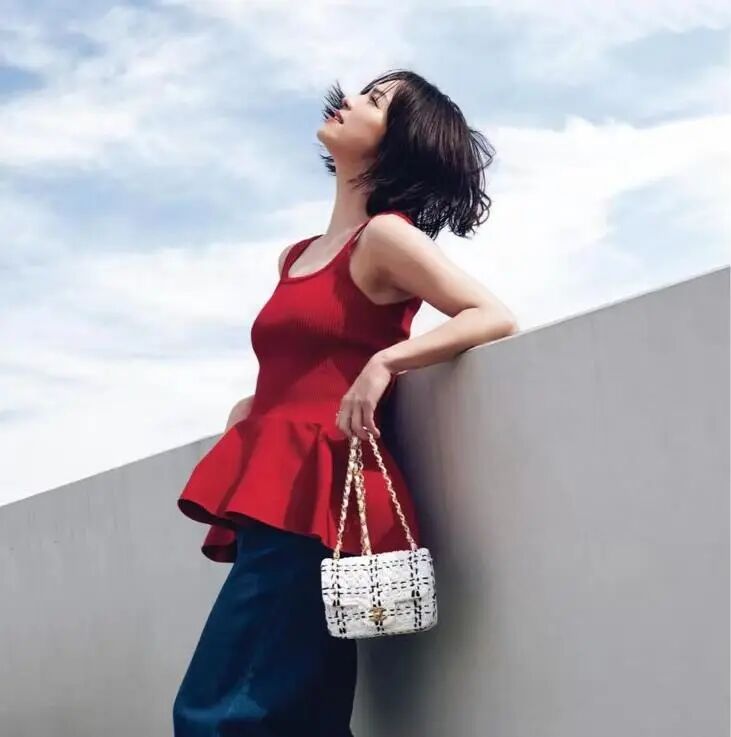 正蓝衬衫,幸好有短袖、领口露肤来缓和,要不然太中性了。搭配黑色阔腿裤与高跟鞋,借助棕色竹编包,带出夏的浪漫氛围。