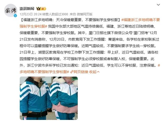 厦门日报社旗下微信公众号“厦门招考”12月21日发布消息称,12月20日,市教育局下发工作提醒:寒潮来临,各学校在家校联系过程中可以温馨提醒学生做好防寒保暖。近期气温较低,不要强制要求学生统一穿校服。