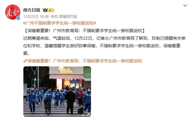 12月22日,记者从广州市教育局了解到,目前已提醒有关单位和学校,温馨提醒学生做好防寒保暖,不强制要求学生统一穿校服返校,保暖最重要。