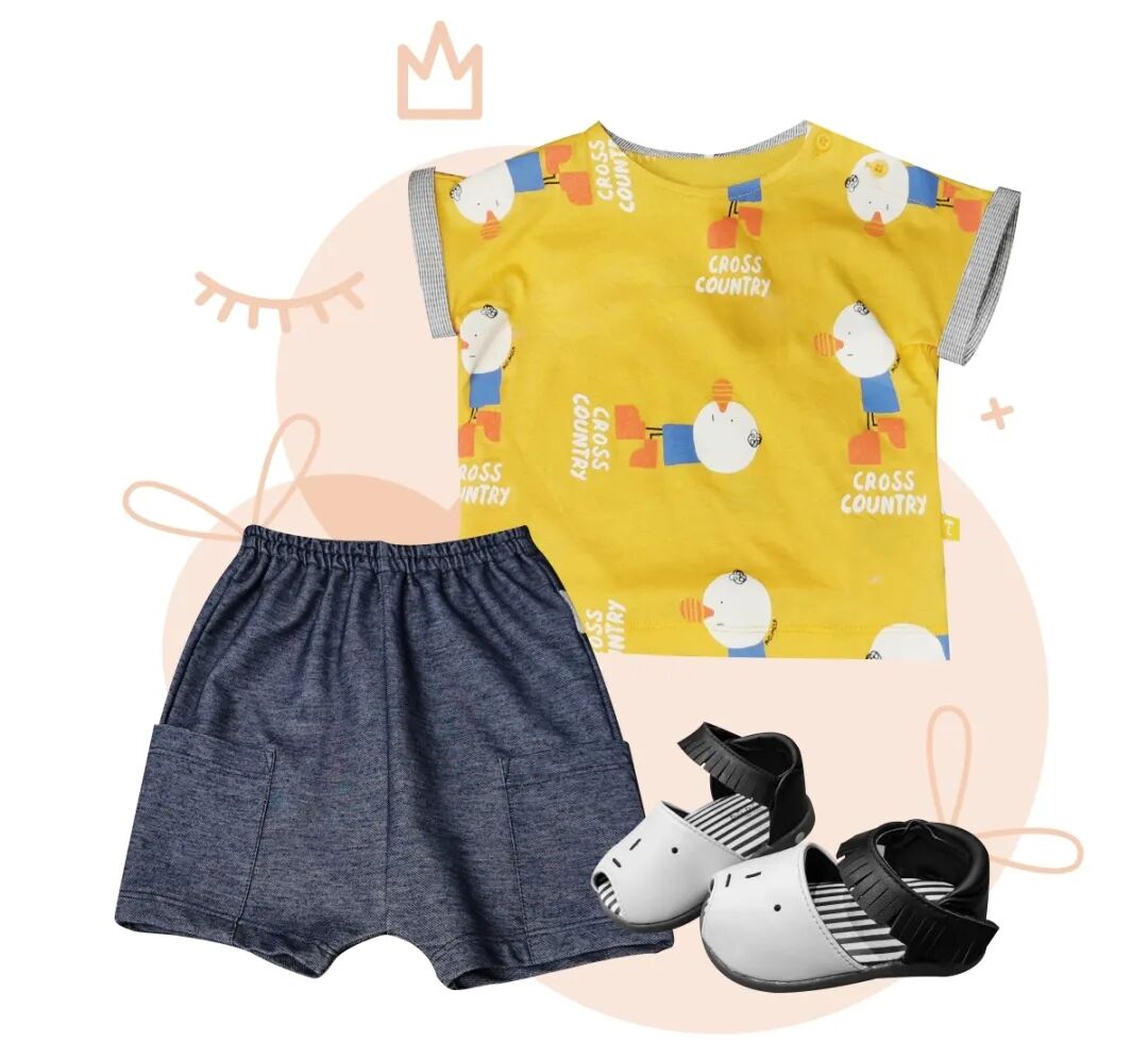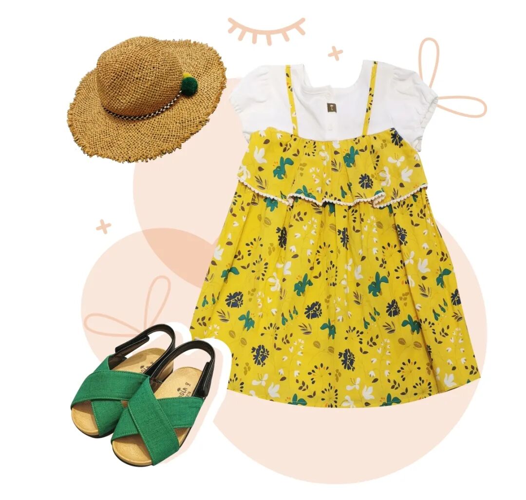 轻柔的透气面料制作的连衣裙,活力的明黄色打底,涂鸦花朵平铺点缀,搭配绿色元素的交叉凉鞋和宽檐草帽,凸显女宝宝的柔软可爱的气质。