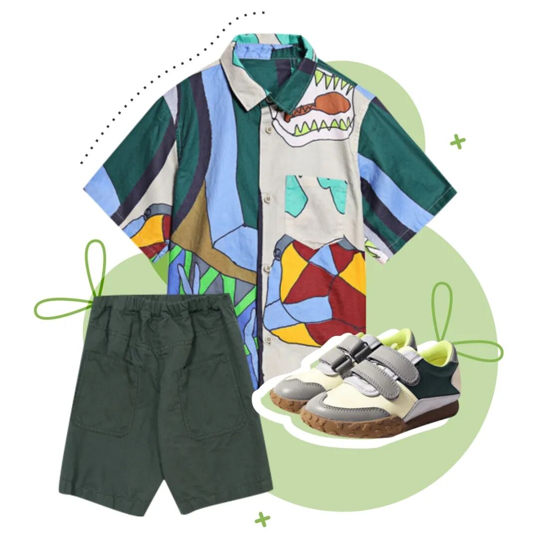 成长是给妈妈最好的礼物,蕴藏大自然灵感的印花衬衫和绿色短裤,舒适的运动鞋让脚下生风,想要变成爸爸那般好看模样。