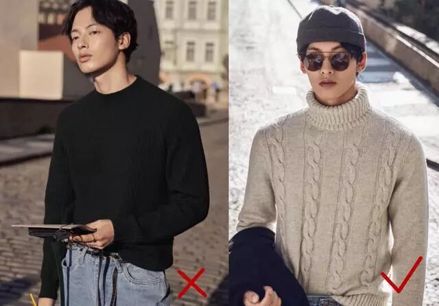 小个男可以利用浅色有视觉膨胀感这一点,平时多穿一些浅色上衣,像右图中男生就很机智,穿的浅色毛衣使肩线看上去更宽了,还能展现出清新的韩范,而右图男生则选择了一件黑色毛衣,肩部线条反而显得更加窄了。