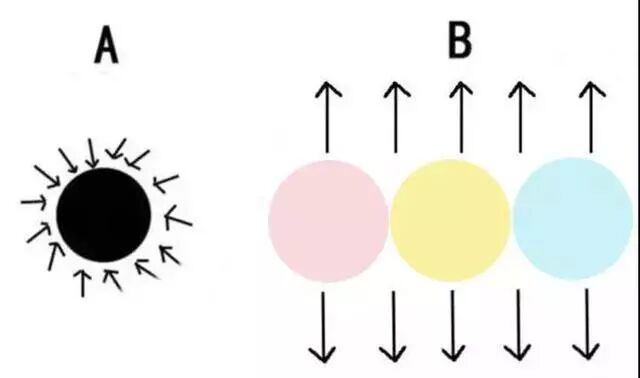色彩根据明度的不同可以分为浅色和深色,从上面的原理图中可以清晰地看出,A图的深色圆具有收缩视觉的效果,所以视觉大小会小于实际,而B图中的浅色系圆由于明度比较高,所以就会起到视觉扩散的膨胀感。