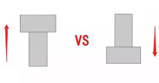 来看一下上图的原理图,左图是上宽下窄的排列方式,由大变小的排列就会在纵向的方向上形成一定的延伸感,而右图是上窄下宽的组合,在视觉上就会显得有点笨重感,视觉方向就更趋于横向。