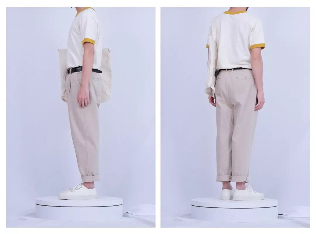 瘦小男生值得一试。上身穿件撞色T恤,下身配条九分休闲裤和一双帆布小白鞋,系上腰带,背上托特包,整体造型带点日系复古气息,是我想要的菜。