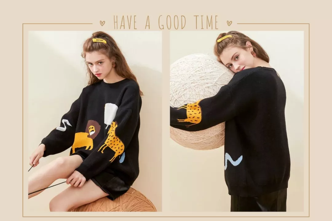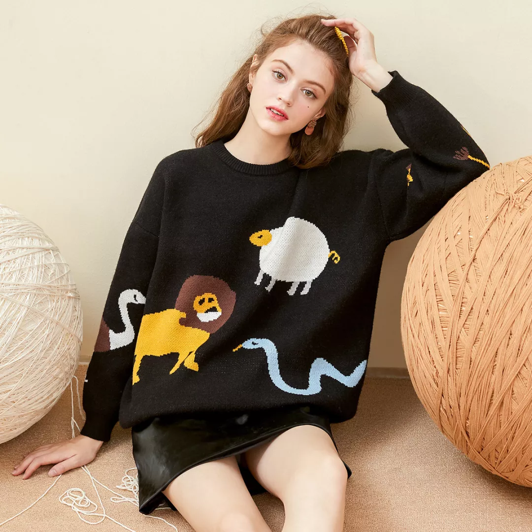 这件可可爱爱的毛衣我可以!本以为会沉闷无聊的黑色,搭配起萌萌的动物图案,一秒活力青春,还很显白哟~