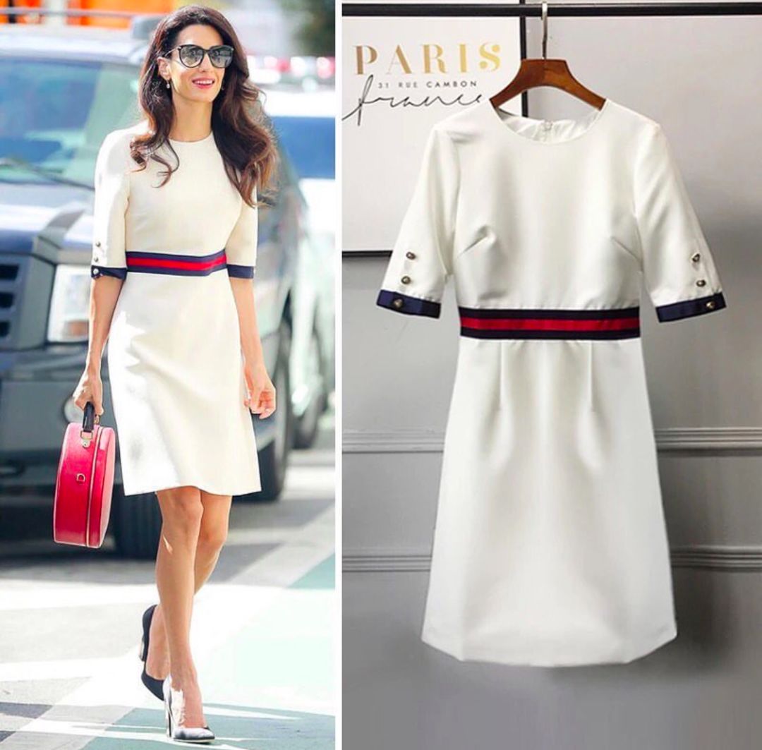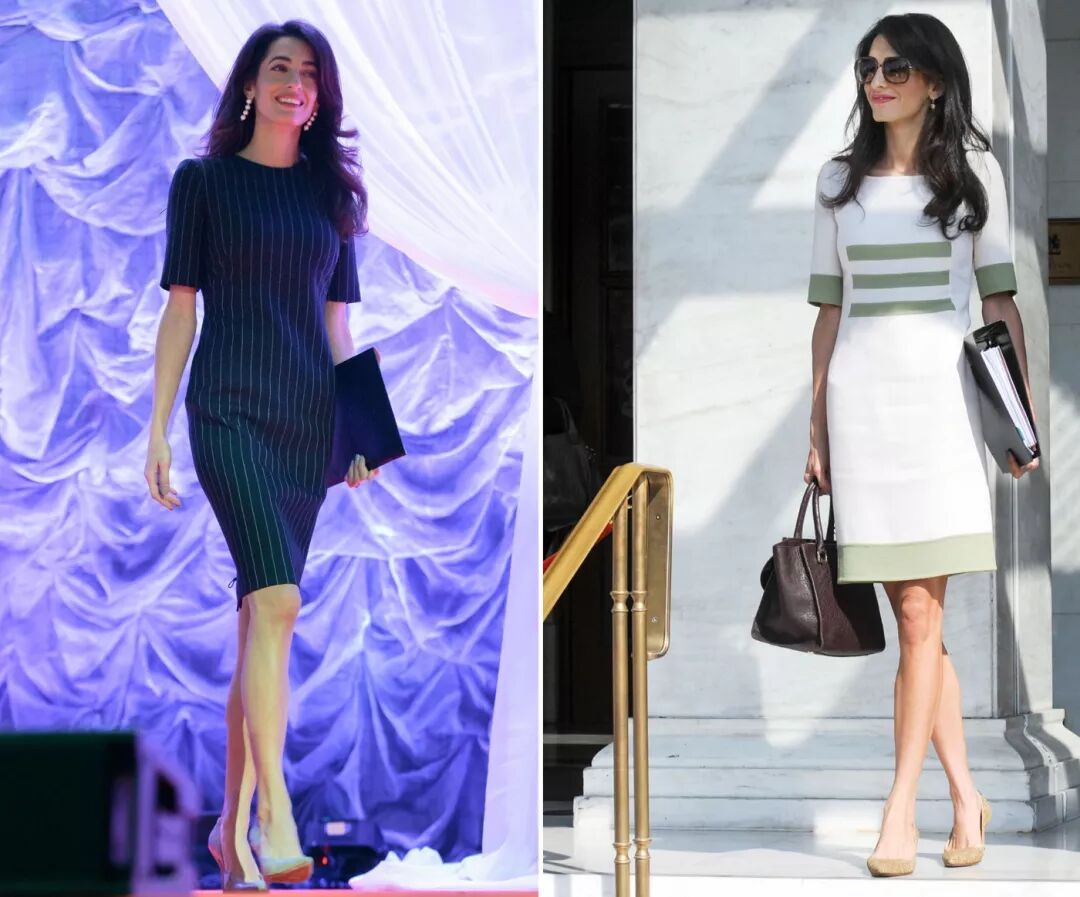 Amal选择的连衣裙,通常是采用了修身的款式,裙长及膝,端庄又大气!