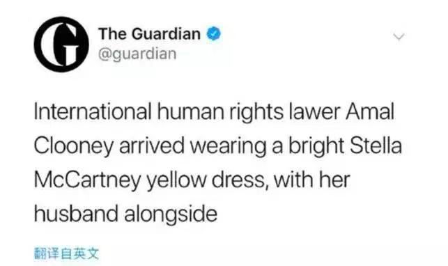 今年5月阿里王子大婚,英国《卫报》在介绍嘉宾的时候,说的是“国际人权律师Amal·Clooney抵达现场,身边是他的丈夫。”