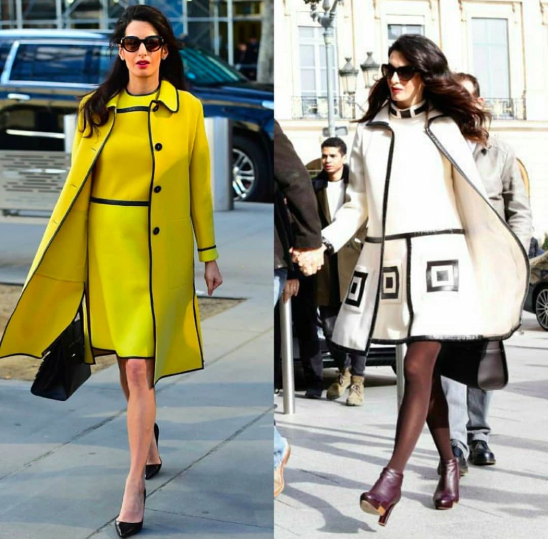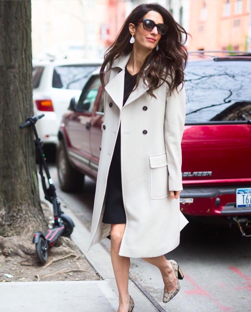 像现在这样的秋冬季节,单穿连衣裙难免太过单薄,这时候Amal通常都会配上一件气场全开的风衣,瞬间一米八有木有!
