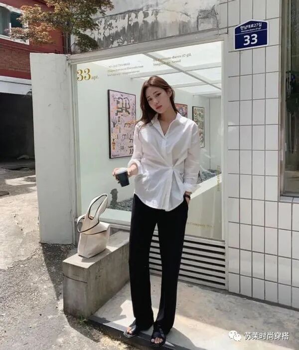 PS:白衬衫采用大V领设计,或者是宽领和无领设计,减少白衬衫的朴素感,整个穿搭更自然时尚。