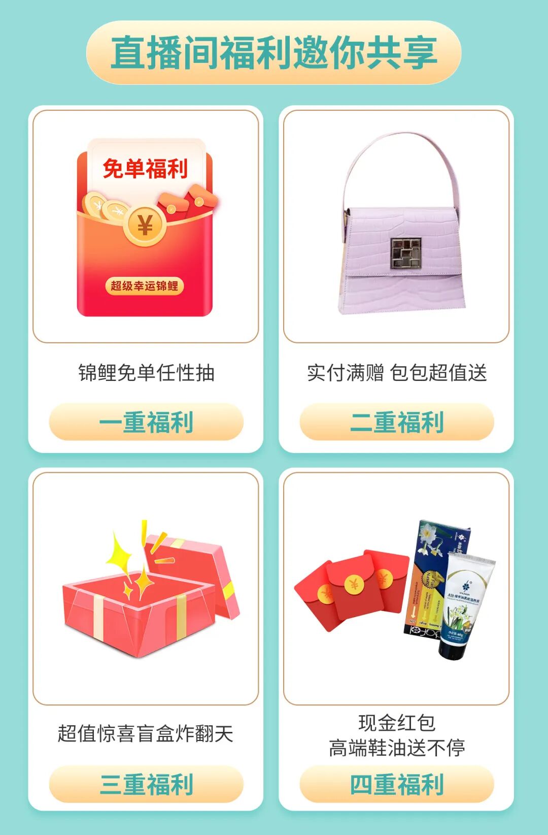 看直播当然得有福利啦,提前剧透一波:锦鲤免单任性抽、满额送包包、还有惊喜盲盒、现金红包高端鞋油送不停~