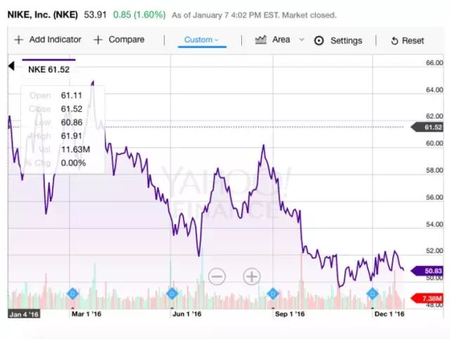 回顾整个2016,耐克是所有蓝筹股里面唯二两支下跌的股票之一,并且是表现最差的,比 2016 年初的 61.5 块下跌了 15%。