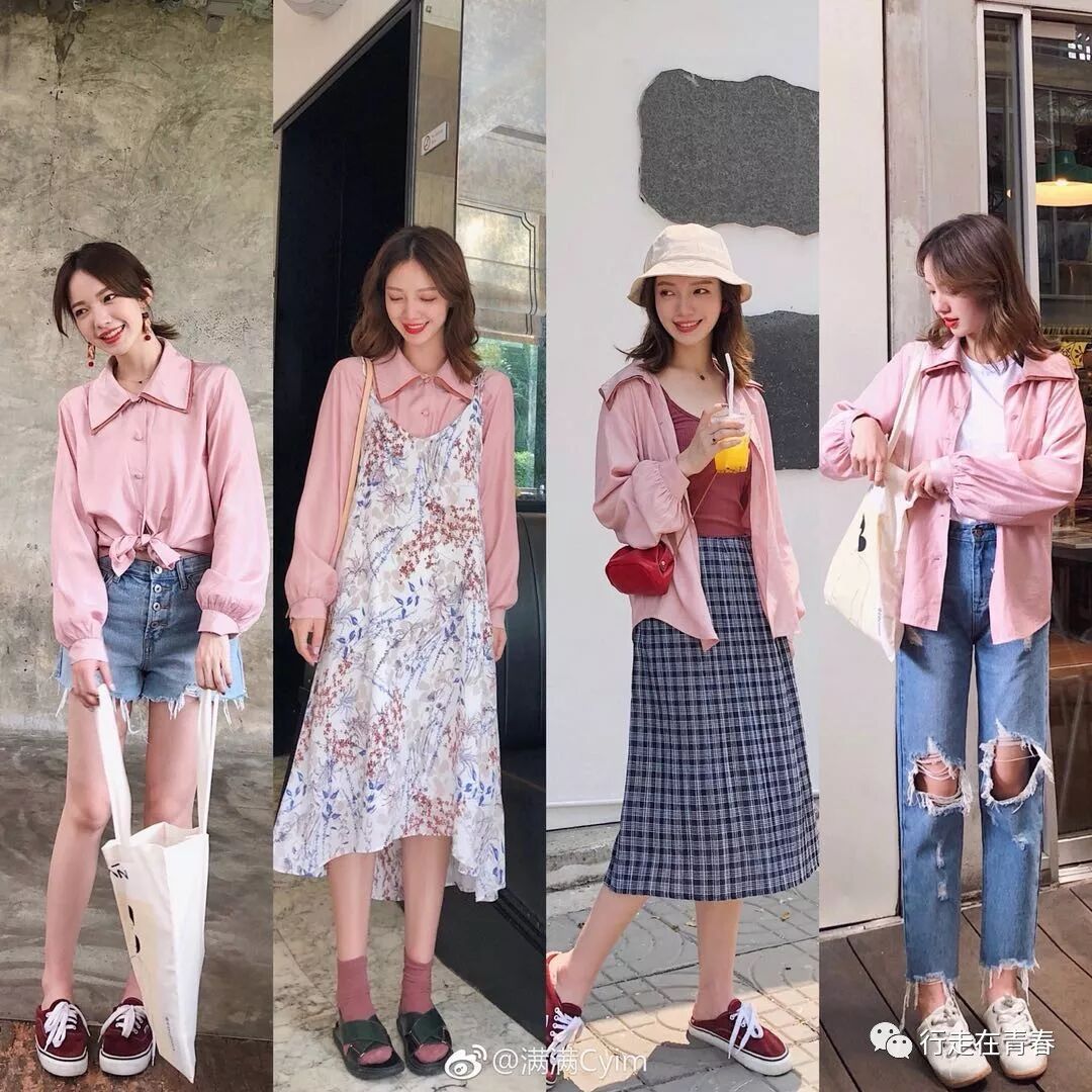 ·中长衬衫前摆扎进裤腰,或全部扎进裙腰塑造腰线,长衬衫扎腰带塑造腰线。