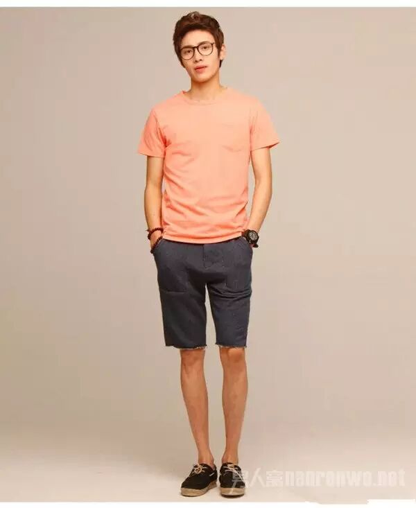 7、橘色简约t恤版型宽松,设计韩范,下身简单配灰色短款马裤,淡淡的色彩搭配很是舒服养眼,烘托出高大挺拔的好身材,尽显夏日清爽暖男的休闲风范,俘获女心。