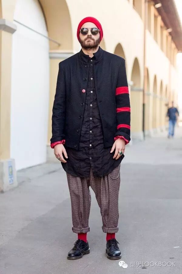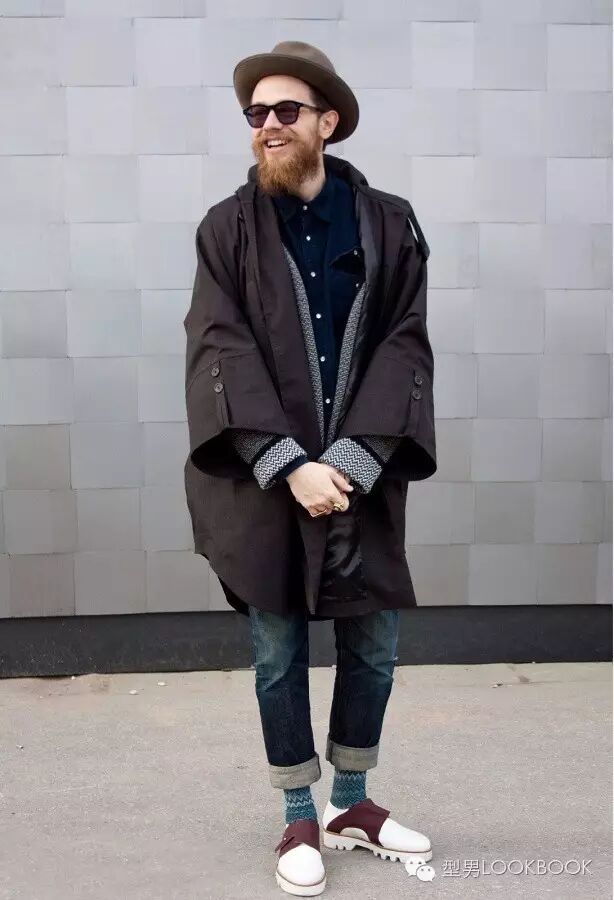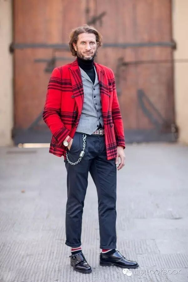 大叔也钟爱红袜子,但是大叔的搭配似乎低调很多,只是把打底衬衫露出领口的部分和袜子呼应,搭配休闲裤和长款夹克看似低调,但整体的搭配效果也不缺精彩细节,做到简约不简单。