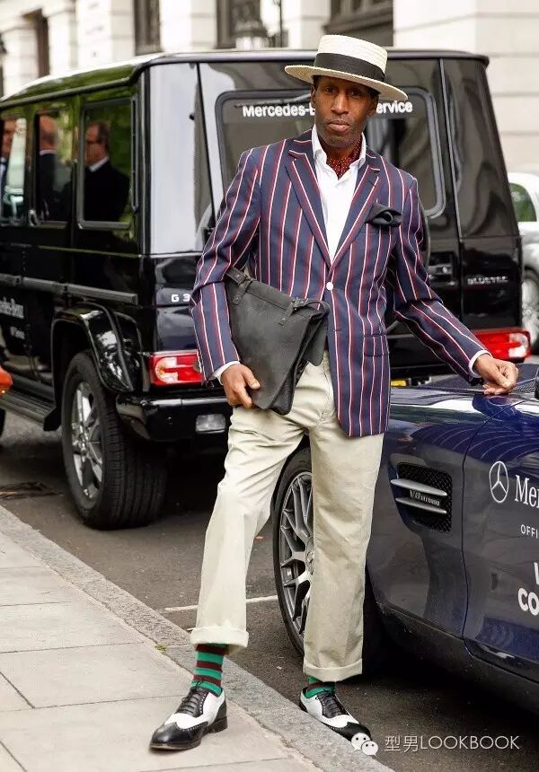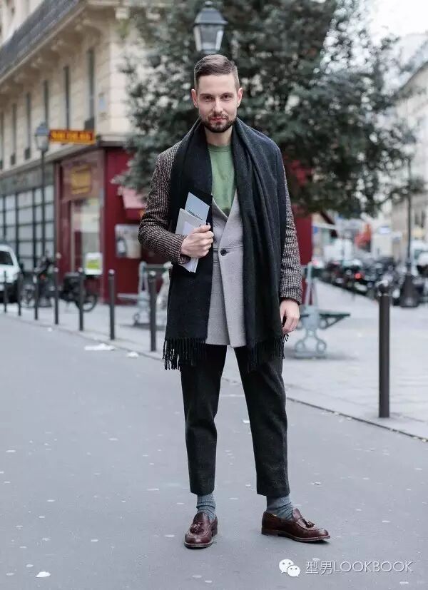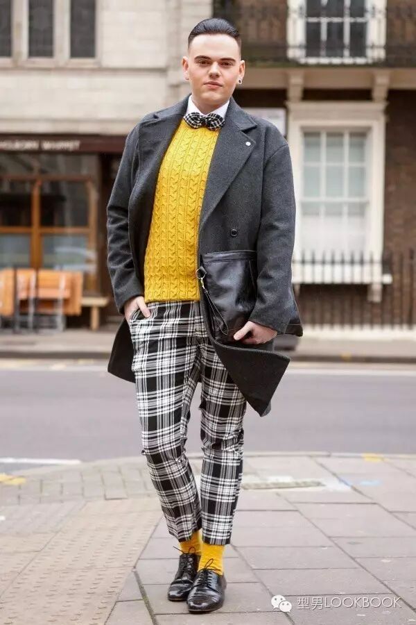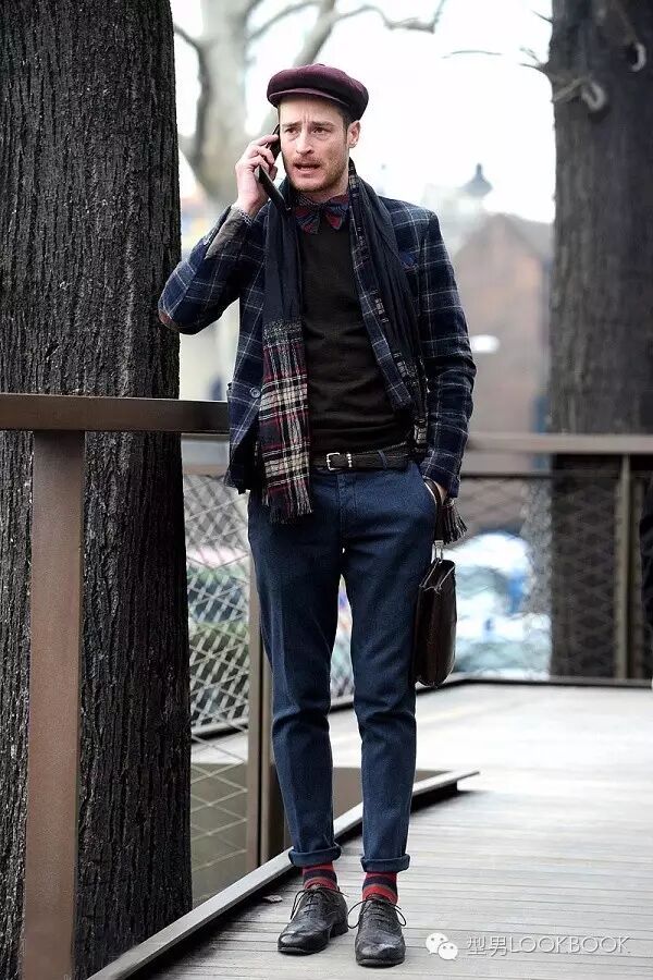 搭配和场景气氛很重要,对于暗条纹彩色的袜子和同样有条纹格子的西装外套很搭,加上围巾和配件的色调都很统一,打造了英伦复古风,当然裤脚要适当的卷起来,把袜子露出来和衣物呼应。