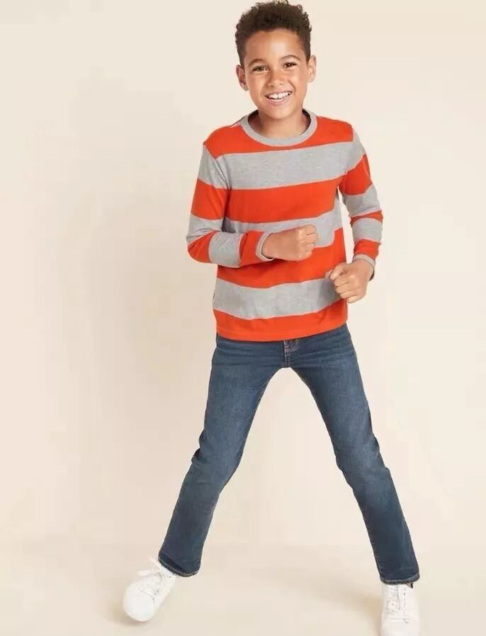 △寒冷冬日, 一抹橙黄色,瞬间暖了心!橙色热烈、灰色温和,两种颜色搭配起来,明艳了大厂街头,可以说是绝对的经典!橙灰相间的条纹上衣,配上牛仔裤和小帆布鞋,您家的萌娃就是整条街上最亮的仔!