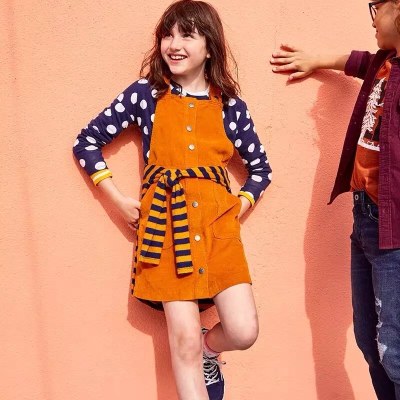 △当灯芯绒遇到背带裙,盖不住小女孩的森女气息和文艺气息。搭配经典的波点图案上衣,既有复古的韵味又有永恒的时尚感,保暖的同时更增加了整体搭配的层次感,活力与甜美兼具,尽显宝贝天真俏皮的模样。