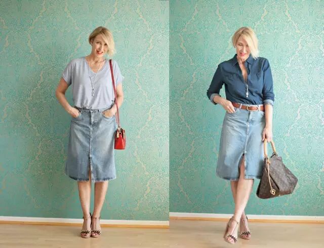 柔软贴身的面料加上宽大的设计对于较胖的身材尤为不可取,不仅暴露了身材上的缺点,还有一种往下塌的懒散无力的感觉。如上面两个造型虽然穿了同一条牛仔裙,右边衬衫虽然也是稍软的休闲衬衫,但撑起的衣领和肩膀使得整个造型非常精神,而且掩盖了胸部过于突出和粗腰的不足。
