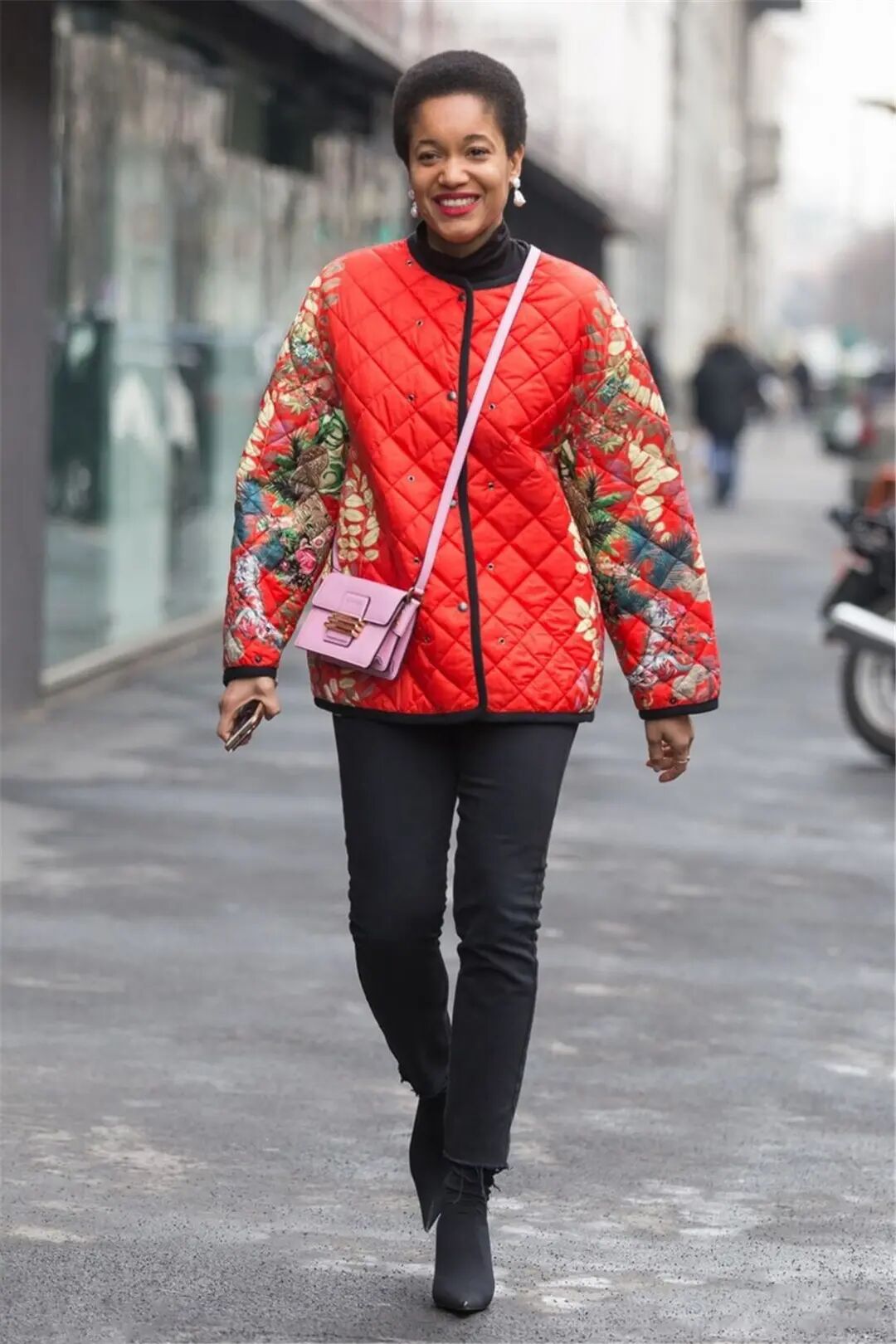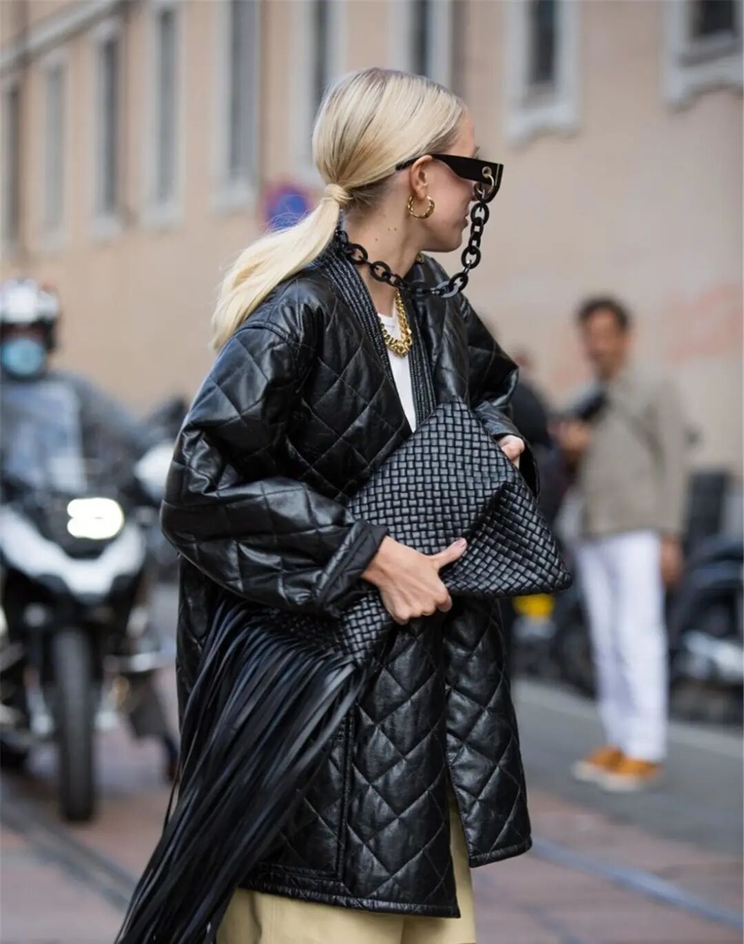 ▲单独的绗缝棉衣拿出来,风格或许比较平淡,可以借助一些风格鲜明的配饰,来穿出时髦个性。