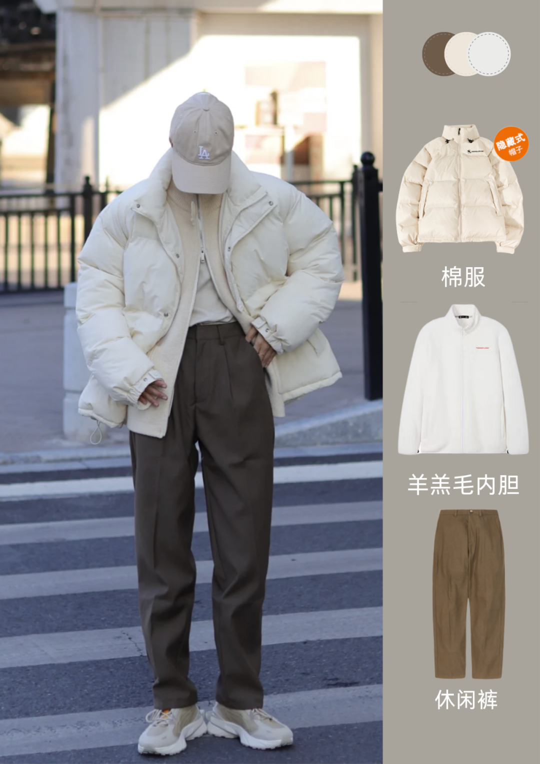上身的“3步保暖法”,一件亲肤锁温的内搭,一件保温的羊羔毛内胆,一件防风防雨的棉服外套,3个都是同色系,下半身再搭配一条棕色的休闲裤,米色的跟棕色的融合,可谓“良配”,拉链拉起来也好看。