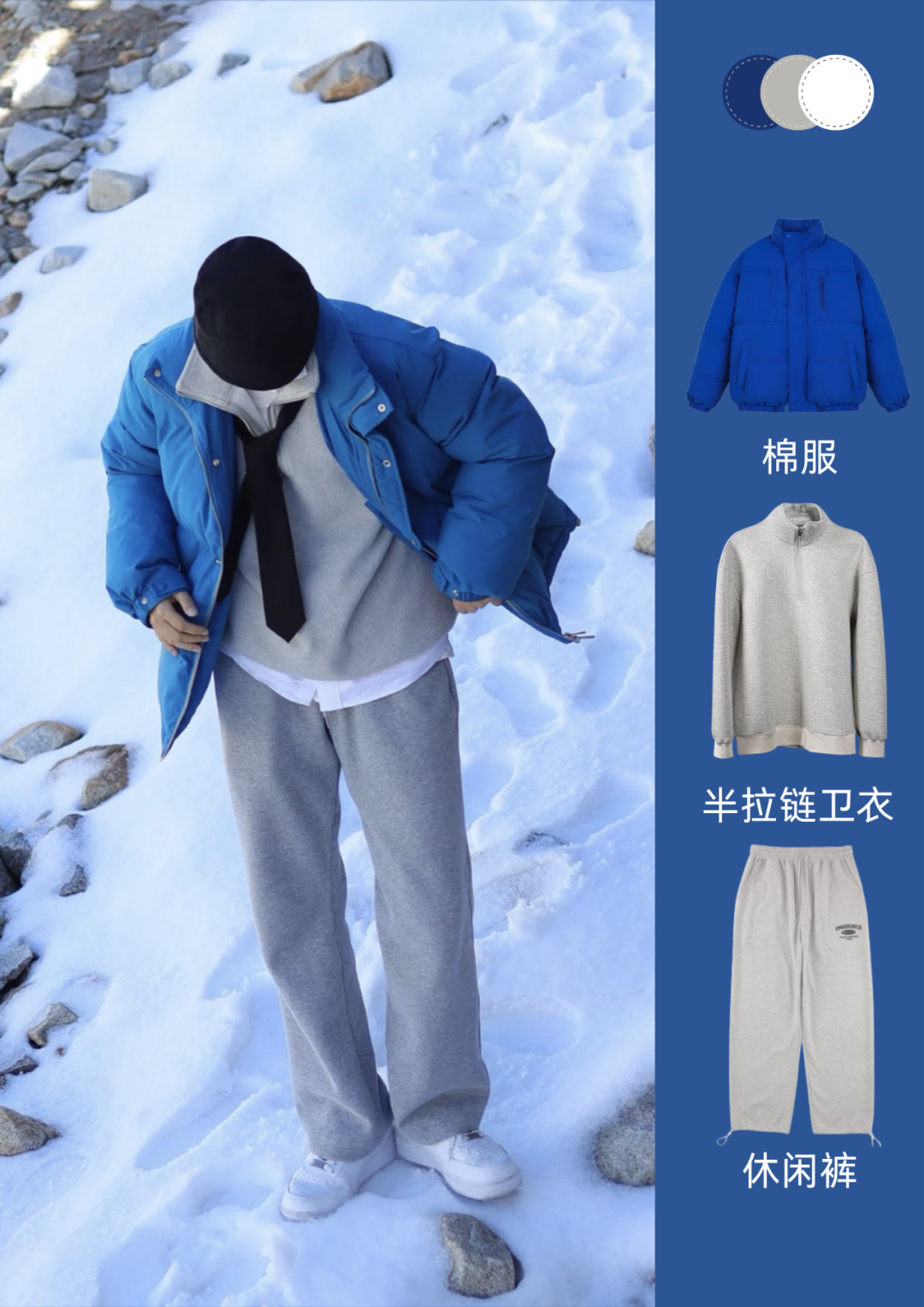 冷白皮的兄弟们,内搭一套卫衣套装,整体身材显高的方法就是内搭同色,外面穿一件蓝色的棉服,保暖又好看,最后一双白色,蓝白呼应,也是绝妙搭配。