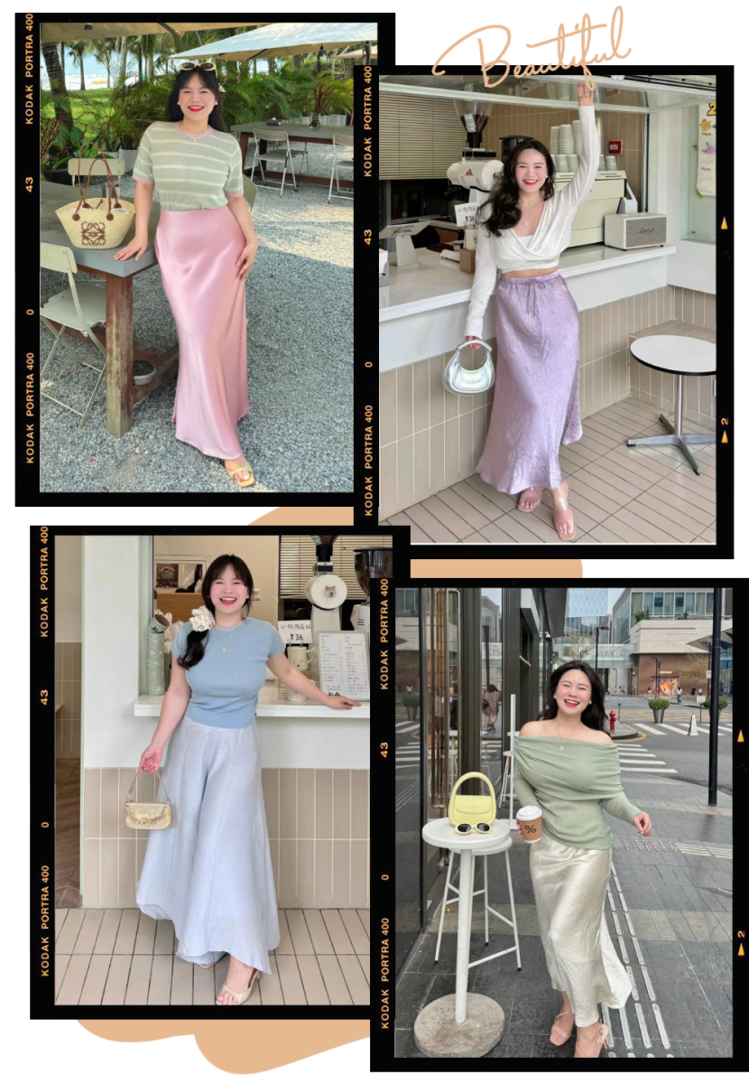 而且丝质的半裙,无形中减轻下半身的重量,衬得人轻飘飘的~