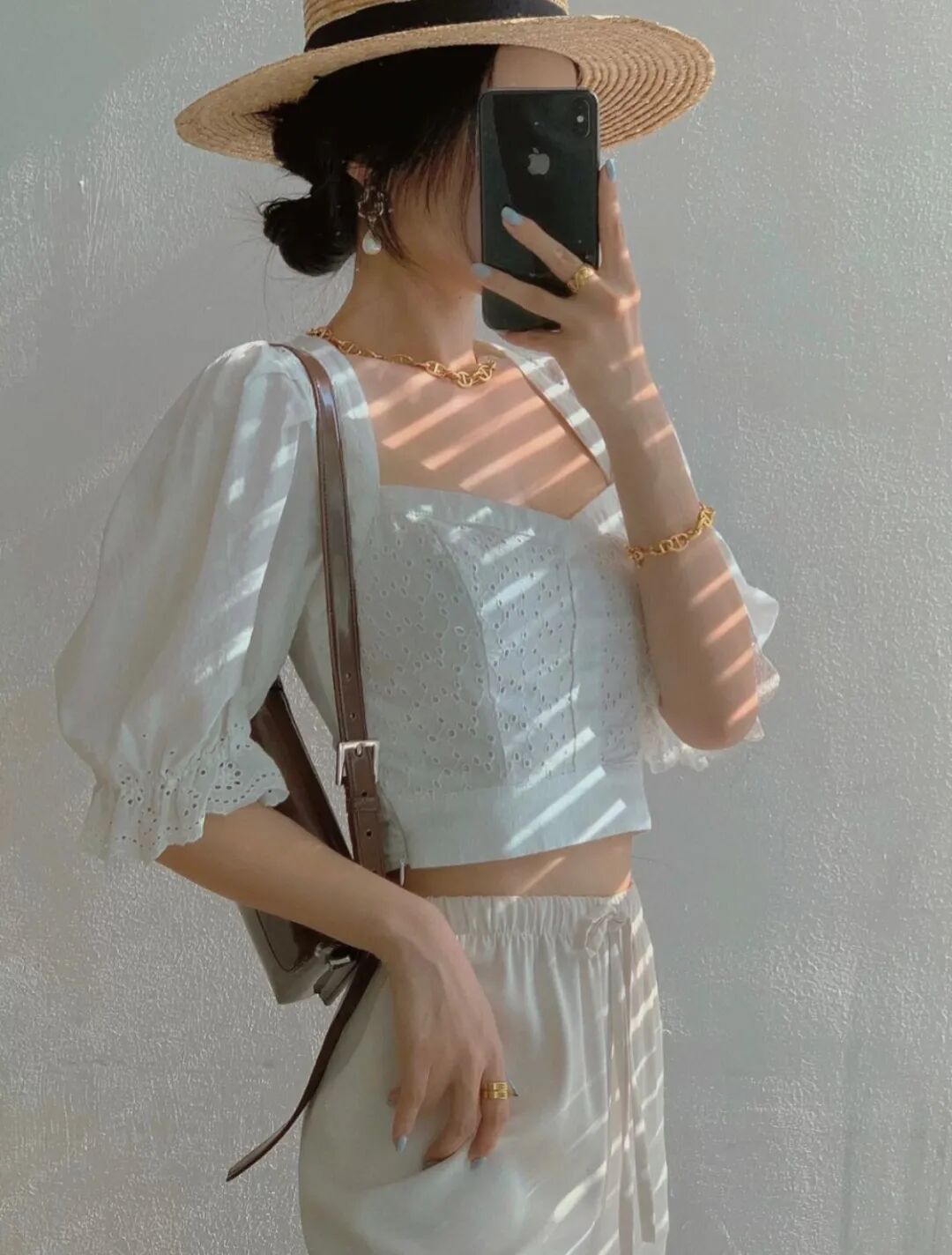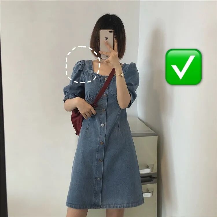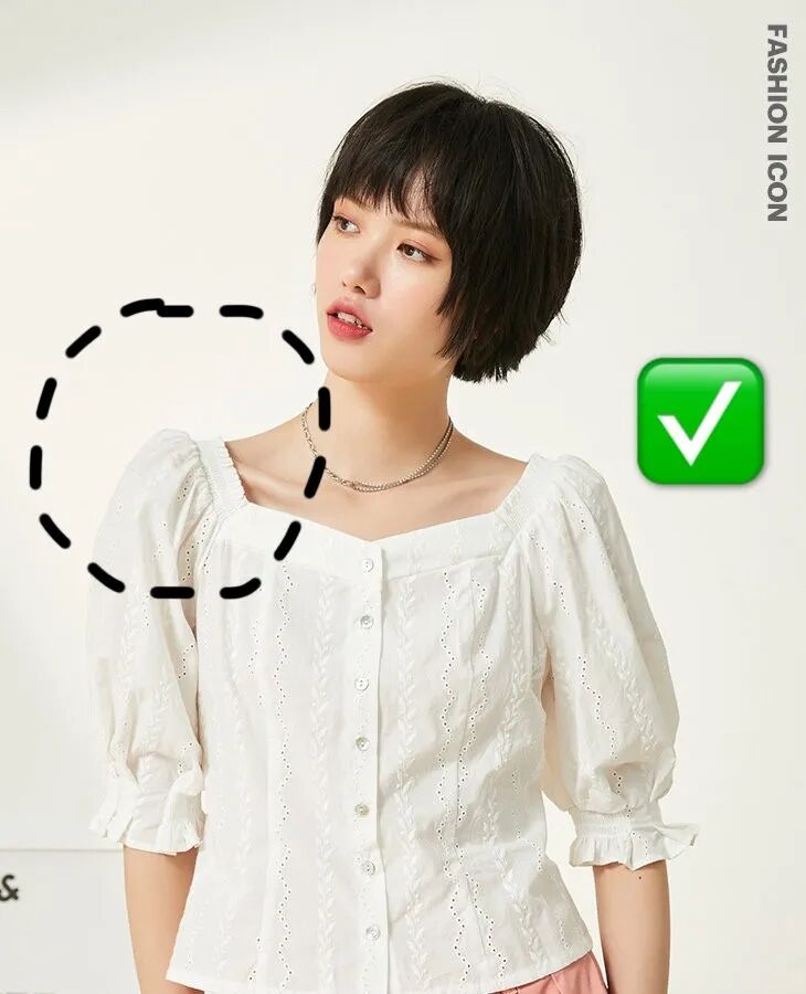 小泡泡袖+肩线靠内,不仅可以在视觉上缩小肩宽,还能通过泡泡袖遮掉手臂上的拜拜肉,一举两得。