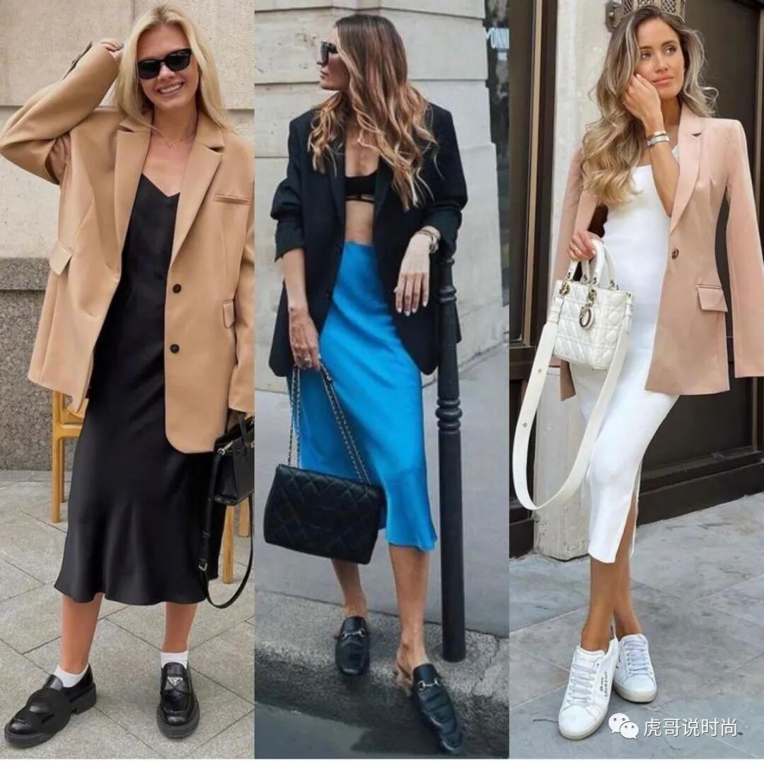 在穿搭西装外套的时候要选松不选紧,因为欧美风的西装穿搭中通常强调的是慵懒且休闲的感觉,而不是正式感和严肃感,下半身搭配高腰款式的半身裙或者是连衣裙,上下身搭配的整体风格就是现在最流行的娘man风。
