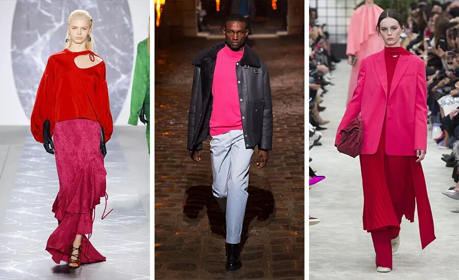 玫红是今年秋冬一款特别的色彩,从四、五年前 Normcore 风靡被打入冷宫以来,玫红色 就鲜少露脸,2018 秋冬系列虽然没有见到玫红轰轰烈烈复出的场面,但不少设计师都选择 在一两款单品上尝试玫红。至于搭配,可能会有些出人意料,本季最受欢迎的玫红搭档是罂粟红,尤其是在女装方面,Valentino、Prada、Marni、Hellessy 等品牌都有呈现玫红搭配罂粟红的造型。