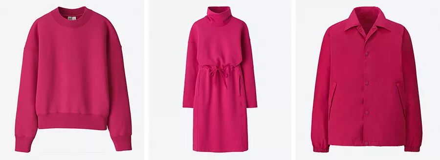 U 系列本季的玫红单品格外强调实用易搭配,并有运动属性在里面,男女装都有运动衫单 品,这一点也是很符合大家的穿衣习惯,对于很多人来说更愿意在运动场景中选择鲜艳的色 彩。