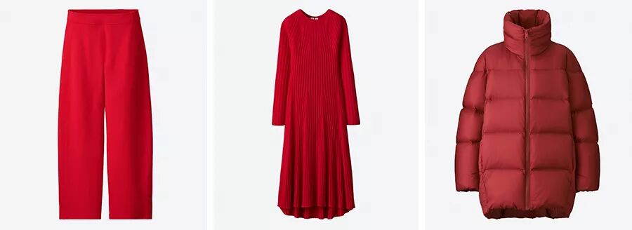 本季女 装这边可以特别留意红色下装,以往更常见的是以红色上装搭配黑色 下装,这次不妨试试红色裤子或者半身裙。U 系列这一次带来了高腰喇叭裤、直筒裤、宽腿廓形感的阔腿 裤 3 条不同款式的红色长裤,大家可以根据各自的腿型来选择,搭配修身针织上衣打造干 练又不乏味的造型。